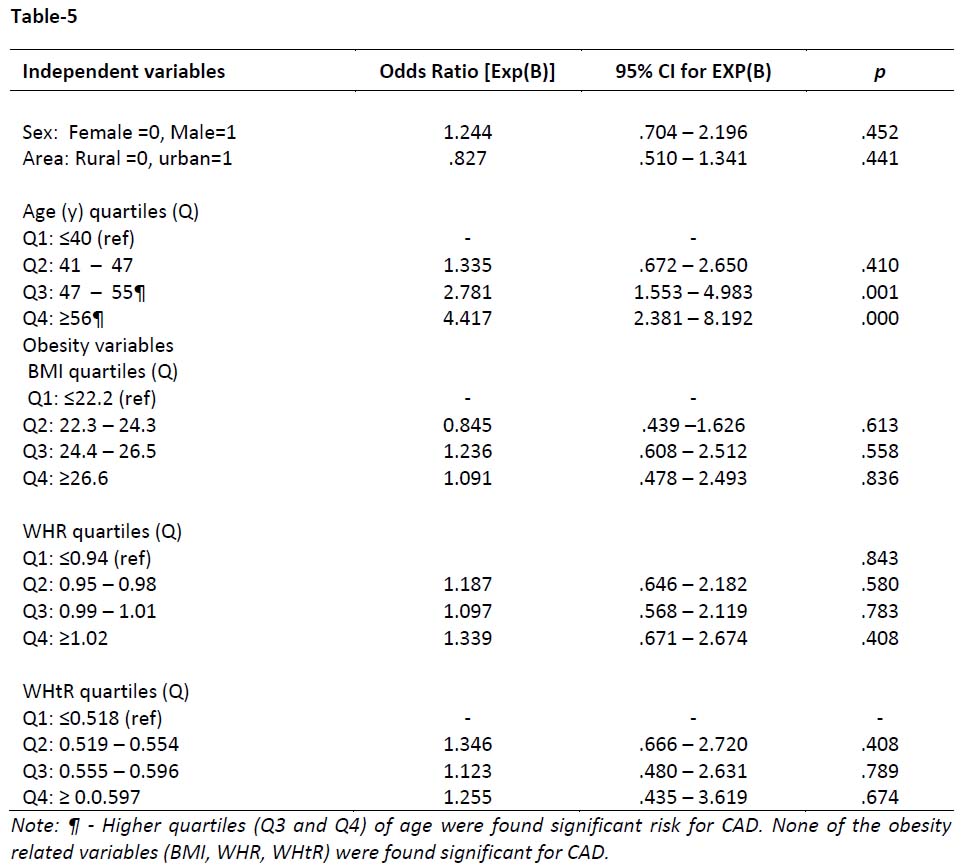 Table-5: Binary logistic regression taking coronary artery disease (no =0, yes =1) as a dependent variable; and sex, area, age, BMI, WHR, WHtR as independent variables. The categorical variables are depicted below