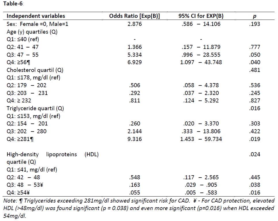 Table-6: Binary logistic regression taking coronary artery disease (no =0, yes =1) as a dependent variable and sex, age, cholesterol, TG, HDL as independent variables. The categorical variables are depicted below.