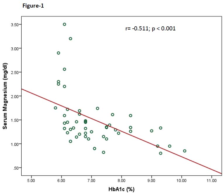 Results: Out of 100 enrolled participants, 50 were diagnosed patients of DM (Group-A) and 50 were age and sex matched apparently healthy individuals (Group-B). The mean age of Group-A and B individuals was 50.5 ± 6.0 and 50.4 ± 5.1 years respectively. Group-A had significantly (p < 0.001) lower serum magnesium concentration compared to Group-B (1.5 ± 0.6 mg/dl vs 2.3 ± 0.5 mg/dl). Serum magnesium levels showed significant negative correlations with HbA1c (r = -0.511, p < 0.001).