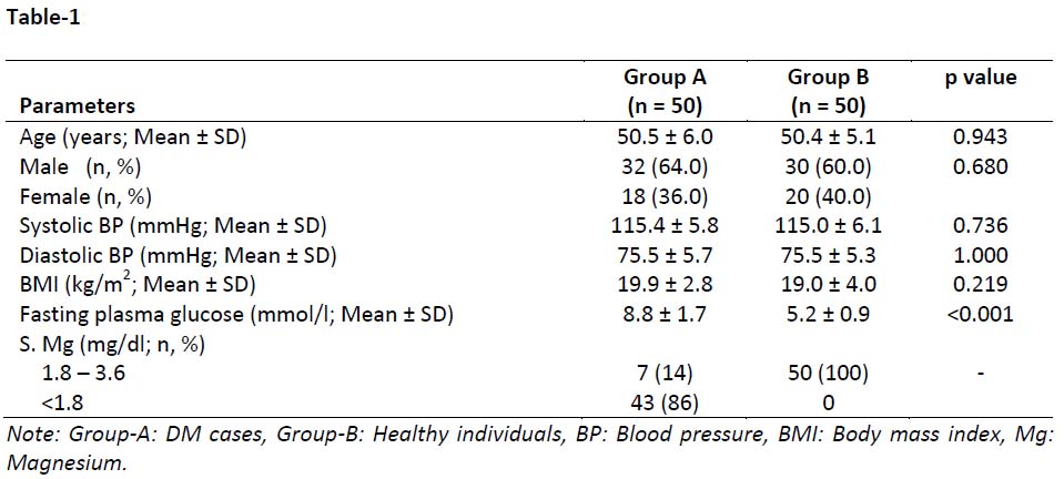 The study was aimed to correlate serum Mg levels with HbA1c of DM patients. Table-1 shows the baseline parameters of the study population. There was no significant difference of age, sex, systolic blood pressure (BP), diastolic BP and body mass index (BMI) between Group-A and B cases. Out of 50 Group-A cases, 43 (86%) had serum magnesium below the normal reference range (< 1.8 mg/dl) while all the Group A cases were within the normal range.