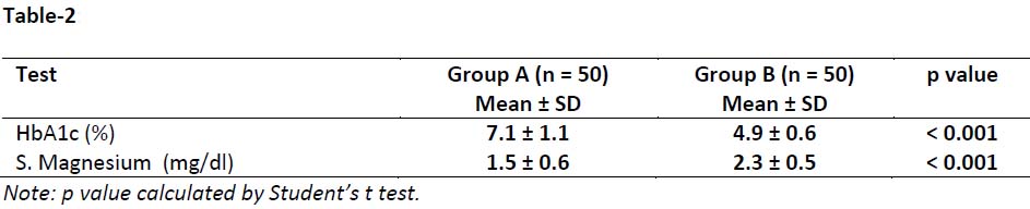 Table-2 shows the serum magnesium and HbA1c levels of the study subjects of both groups. Fasting plasma glucose and HbA1c levels were significantly (p < 0.001) higher in DM patients (Group-A) than healthy individuals (Group-B) while serum magnesium levels were significantly (p < 0.001) low in DM patients compared to healthy individuals.