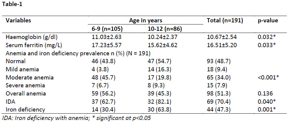 Table-1: Hemoglobin, serum ferritin and anemia status of the study population according to age groups