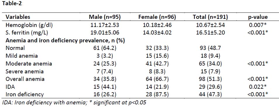 Table-2: Hemoglobin concentration, serum ferritin and anemia status of the study population according to the gender