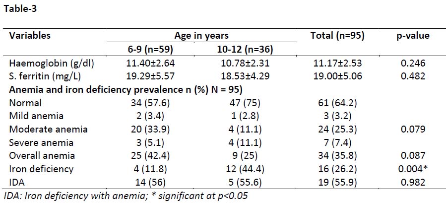 Table-3: Hemoglobin, serum ferritin and anemia status in male children of different age groups
