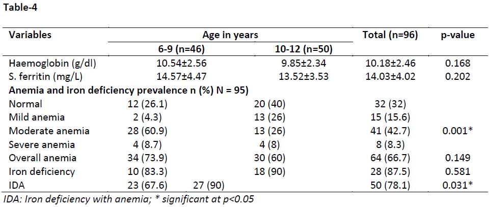 The mean hemoglobin and serum ferritin concentration of the male study children aged 6-9 and 10-12 years were not significantly (p>0.05) different (Table-3). The results show that normal and severe anemia were more prevalent among male children aged 10 -12 years (75% and 11.1%) than 57.6% and 5.1% among male children aged 6 - 9, p>0.001. A total of 34 (35.8%) male children had anemia; There was no significant difference of prevalence of IDA in male children between aged 6-9 and 10-12 years (56% vs. 55.6%; p=0.982) while ID was significantly (p=0.004) more among the male children aged 10-12 (44.4%) compared to those aged 6-9 years (11.8%, Table-3).