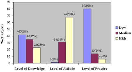 Among the study subjects, the levels of knowledge were low in 42%, medium in 35% and high in 23%. (Fig.1). The levels of attitude were also described accordingly as low 1%, medium 31% and high 68%. (Fig.1). The levels of practice of study subjects were found to be low in 80%, medium in 14% and high in 6% (Fig.1).