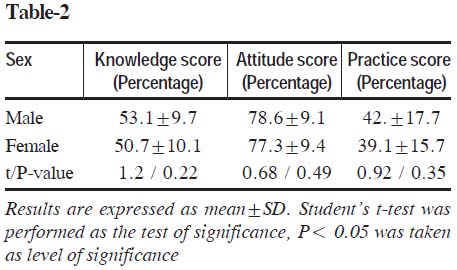 The KAP scores of male and female did not differ significantly (53.1±9.7 vs 50.7±10.1, 78.6±9.1 vs 77.3±9.4, 42.1±17.7 vs 39.1±15.7 ; Table 2).