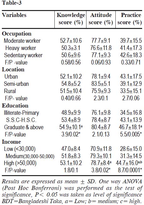 The KAP scores of moderate, heavy and sedentary workers (52.7±10.6 vs 50.3±3.1 vs 50.6±9.6; 77.7±9.1 vs 76.6±11.8 vs 77.1±9.3; 39.7±15.5 vs 41.4±17.3 vs 42.6±18.3) did not differ significantly. The KAP scores of urban, semi-urban and rural residents did not significantly differ (52.1±10.2 vs 54.8±5.2 vs 51.5±10.4, 78.1±9.4 vs 83.5±5.1 vs 75.9±9.3, 43.1±17.5 vs 39.1±12.9 vs 33.5±15.1; P=ns). Compared with illiterate-primary group (48.9±9.9%) knowledge score was significantly high in secondary and graduate (53.4±8.9% and 54.9±10.1%, P=0.022) groups. Practice score of illiterate-primary group (34.5±16.8%) was significantly lower than secondary and graduate (43.1±13.9% and 46.7±18.1%, P=0.005) groups but they did not differ on attitude. Income group did not differ on knowledge. Attitude score of high-income group (78.7±8.4%) was better than low-income group (70.9±11.8%, P=0.02). Compared with high-income group (44.7±16.0%), practice score was better than medium income group and low-income group (31.3±14.5% and 28.6±15.0%, P=0.0001) (Table 3). Better knowledge was associated with better attitude (r= 0.275, p=0.004) and also better attitude was associated with better practice (r= 0.187, p=0.05).