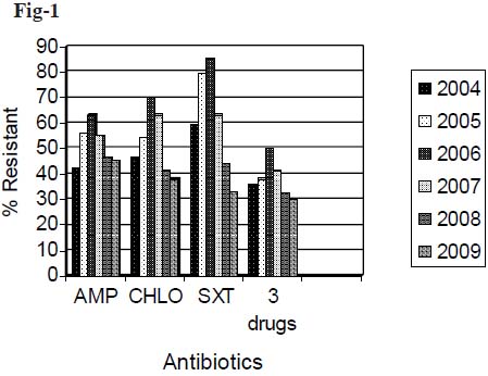 Fig-1: Single and multi drug resistance rate to 3 first line antibiotics namely ampicillin (AMP), chloramphenicol (CHLO) and cotrimoxazole (SXT) of isolated S. Typhi during 2004-2009. Note: 3 drugs indicate concurrent resistance to AMP, CHLO and SXT