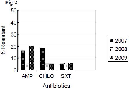 Fig-2: The resistance pattern of isolated S. Paratyphi A to three first line anti- antibiotics during 2007-2009.