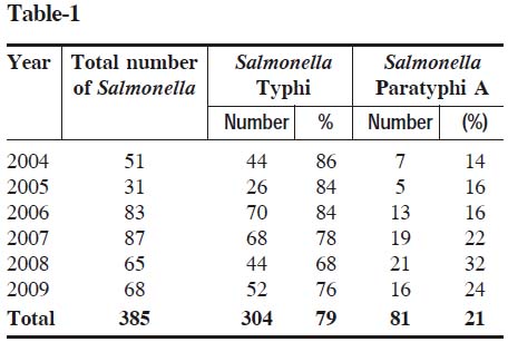 A total of 385 Salmonella were isolated from blood cultures over the period of 6 years. S. Typhi was the predominant serotype followed by Salmonella Paratyphi A (Table-1). The isolation rate of S. Typhi has gradually decreased where as that of S. Paratyphi A has increased over last six years.