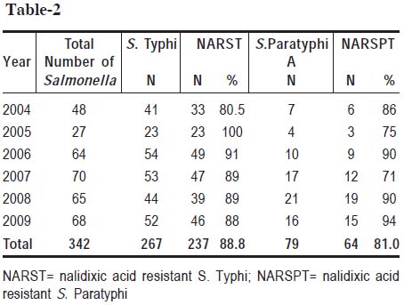 Table-2: Rate of isolation of nalidixic acid resistant S. Typhi and S. Paratyphi A from 2004-2009.