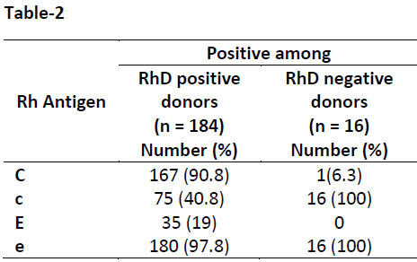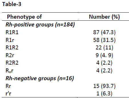 Table-3: Phenotype distribution of Rh-positive (n =184) and Rh-negative groups (n=16)