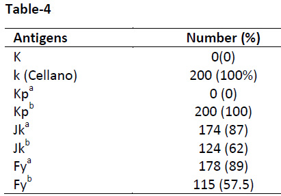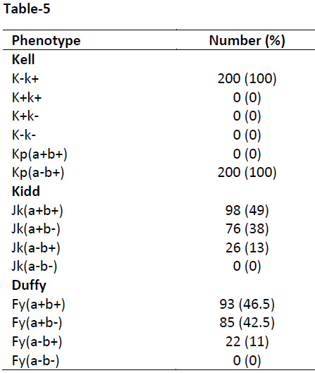 Table-5: Distribution of Kell, Duffy and Kidd phenotypes in study population (N=200).