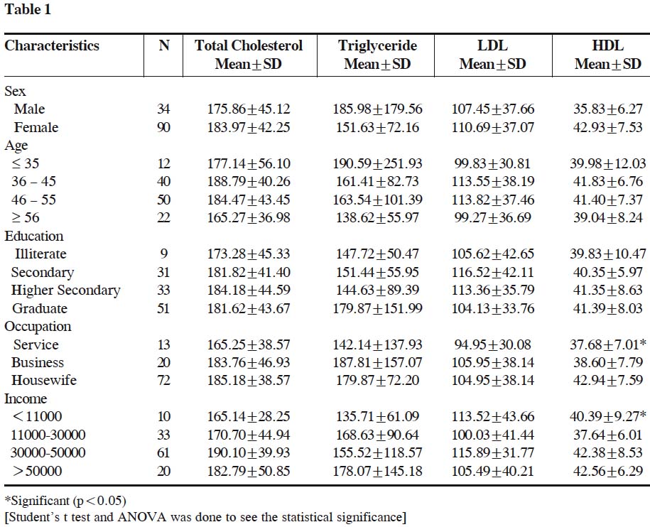 Businessmen had highest mean cholesterol (40%) and TG (45%) among all occupation groups. Housewives had highest mean HDL (42.94±7.59mg/dl). T. cholesterol, TG and LDL was not statistically significant but the difference of HDL was statistically significant between housewives and respondents of other occupation (F= 5.87, p < 0.05). This cannot be explained why the housewives had significantly higher level of HDL than other occupational groups. It may be due to less psychosocial stress or dietary habit or household physical activities or may have combined influence. The study had several limitations. Had this study included anthropometry and dietary intake it could have some chances to explain further. Probably due to small sample size associations of lipid fractions with age, sex, education, occupation and family-income could not be estimated. The study did not include the duration of diabetes which could also have influence on the interaction of the said socio-demographic characteristics. The other important limitation is that there were no reference values of lipid fractions for Bangladeshi population for valid comparison.