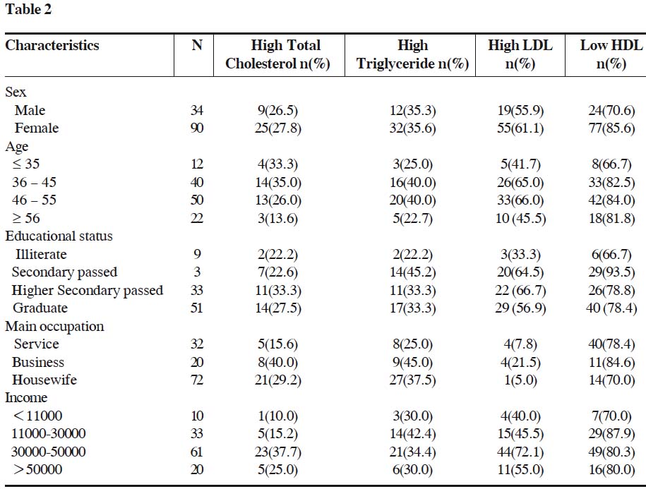 According to standard cut-off value the lipid profile data were categorized into normal and abnormal and the influence of socio-demographic status was tested.