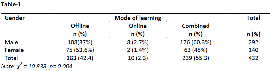 Results: Out of a total of 432 students, more than 3/4th of students (78.2%) believed that combined approach would lead to improvement in learning. Around half (53.6%) of the female students were relying predominantly on offline learning compared to 37.0% of male students (p = 0.004). Flexible schedule and personal convenience was reported as the most common benefit of online learning while lack of interaction with peers and connectivity issues were found to be the major disadvantages.