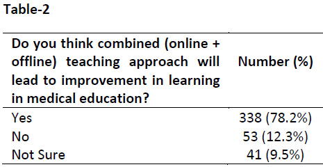 Close to 3/4th of the respondents (n= 338, 78.2%) believed that blended mode of teaching would lead to improvement in medical education (Table-2).