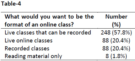 Framework of blended learning: Live classes that can be recorded was the most preferred (n =248, 57.4%) format for online class. Around 1/5th of the students preferred recorded classes and live online classes (n= 88, 20.4% each) and only 1.8% (n=8) of the students preferred reading material only (Table-4). With regards to content of class, 88.7% (n= 383) of the students preferred video with supplementary reading material, 9.0%(n=39) preferred video content only and 12.3% (n= 53) preferred reading material only.