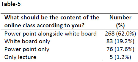 With regards to delivery of content in an online class, majority (n=268, 62.0%) of the students favoured both Power Point alongside white board teaching, 19.2% (n=83) students preferred white board teaching only, 17.6% (n=76) preferred only Power Point teaching while only 1.2% (n=5) students desired lecture only (Table-5).