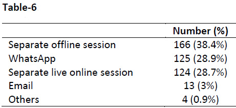 Addressing the queries: Preferred methods for clarification of doubts by the students were: separate offline session (n=166, 38.4%), WhatsApp (n=125, 28.9%), separate online live session (n=124, 28.7%), and email (n=13, 3.0%) [Table-6]. A little over one-third of respondents (n=157, 36.3%) said that queries should preferably be clarified before the next class, 25.7% (n=111) said that it should be addressed within a day, 22% (n=95) thought that within 2-3 days is fine, and 16% (n=70) wanted this done within few hours.