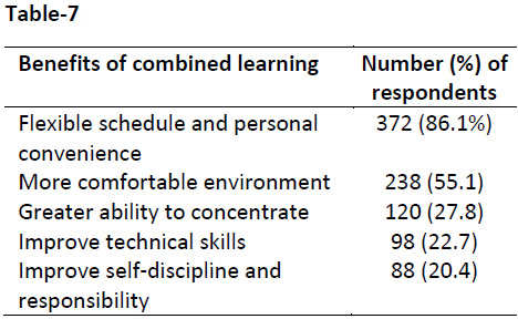 Benefits and challenges: Flexible scheduling and personal convenience was the most common listed item by 86% (n= 372) of the respondents when asked about benefits of combined learning. More comfortable environment and greater ability to concentrate were other advantages listed by 55.1% (n=238) and 27.8% (n=120) of respondents respectively while 22.7% (n=98) thought that it would lead to improvement in technical skills and 20.4% (n=88) believed that it might also lead to improved self-discipline (Table-7).