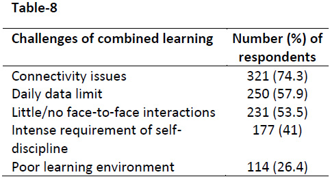 Table-8: Challenges of combined learning as perceived by students