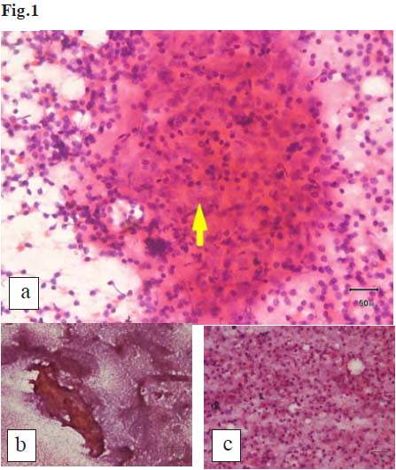 Fig.1: H&E stain of FNA aspirated material showing different smear types: (a) Epithelioid granuloma without caseous necrosis pattern. FNA smear showing a granuloma consisting of epithelioid cells intermixed with lymphocyteswithout caseous necrosis (Type 1). (b) Caseous necrotic pattern - only fragmented amorphous eosinophilic tissue debris is present (Type 2). (c) Necrotic pattern - note the numerous polymorphs and the absence of epithelioid granuloma (Type 3)