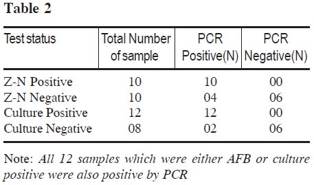 All of the AFB and culture positive cases were also positive by PCR (Table-2). But it is important to note that out of 10 AFB negative cases 4 became positive by PCR. Similarly, out of 8 culture negative cases 2 were positive by PCR. Out of 14 positive cases, 3 were Mycobacterium other than tuberculosis (MOTT) as detected by culture and PCR.