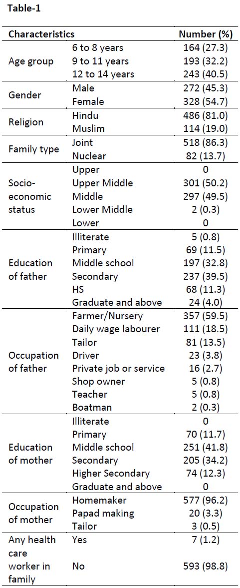 Table-1: Distribution of the study participants according to the socio-demographic profile (N=600)