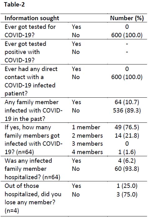 Table-2: Distribution of the study participants according to COVID-19 related information (N=600)