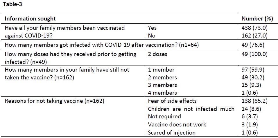 About 73% of the families had all their members vaccinated against COVID-19. Out of the 64 people infected with COVID-19 in past one year, 49 had received two doses of vaccine prior to getting the infection. Most common reason for not taking the vaccine was fear of side effects (Table-3).