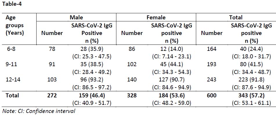 Table-4: Seroprevalence of SARS-CoV-2 IgG antibodies among the study participants (N=600)