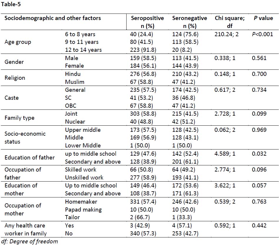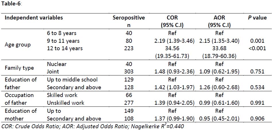 On performing Pearson’s Chi Square test, socio-demographic categories such as age group and father’s education were found to be significantly associated with seroprevalence. The variables which were considered biologically plausible to be included for multivariable binary logistic regression were age group, family type, father’s education, father’s occupation, and mother’s education. However, on multiple regression analysis only higher age group, 9 to 11 years and 12 to 14 years had statistically significant higher adjusted odds ratio of seropositivity (Tables-5 and 6).