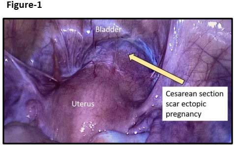 Given the presence of fetal cardiac activity and the potential risk of uterine rupture, the patient was scheduled for surgical intervention rather than conservative management. under spinal anesthesia, laparoscopic hysterotomy was performed. Intra-operative findings included a bulging area at the site of the previous uterine scar, confirming the location of the ectopic pregnancy. The gestational sac was successfully extracted, and intra-operative bleeding was within normal limits (around 200 ml). Histopathological examination of the tissue confirmed the presence of products of conception consistent with a scar pregnancy. The patient had an uneventful postoperative recovery and was discharged in stable condition on the third postoperative day.