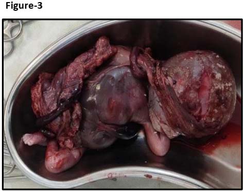 Intra-operatively, the amniotic sac containing a macerated fetus was found protruding through the anterior uterine wall at the previous scar site. The fetus and placental tissue were carefully extracted, and hemostasis was achieved. A fetus weighing 340 grams and a placenta weighing 150 grams were delivered. The postoperative course was uneventful, and the patient was discharged in stable condition on the fifth postoperative day.