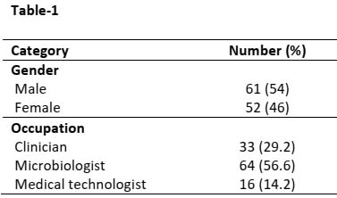 Pre-and post-test questionnaires included 20 multiple choice questions to test knowledge of healthcare professionals regarding melioidosis. A total of 113 participants responded to the pre-test questionnaires, while only 87 of them attended the post-test questionnaire, indicating a post-test dropout rate of approximately 23%. Male (61, 54%) participants were more in number than female (52, 46%). More than half of the participants (64, 56.6%) were microbiologists, followed by 33 (29.2%) clinicians, and 16 (14.2%) medical technologists. The gender distribution of the participants and their occupation are shown in Table-1. Answering patterns to the questions are shown in Table-2.