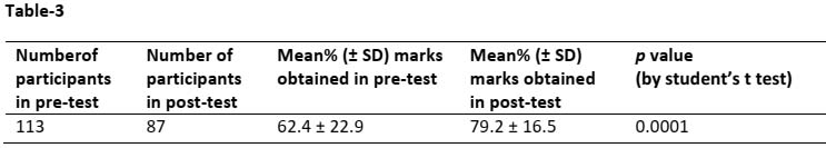 We believe our study has certain limitations. First, the sample size was very small. Larger studies can be done in future to critically compare pre-test and post-test performance. Secondly, only 87 out of 113 people participated in post-test assessment. Thirdly, as the session was carried out online, the level of engagement of the participants could not be evaluated although, the performance improvement in post-test analysis indicates towards sufficient engagement of the respondents. Assessing after six months could give a better retention status, which should be considered in future.