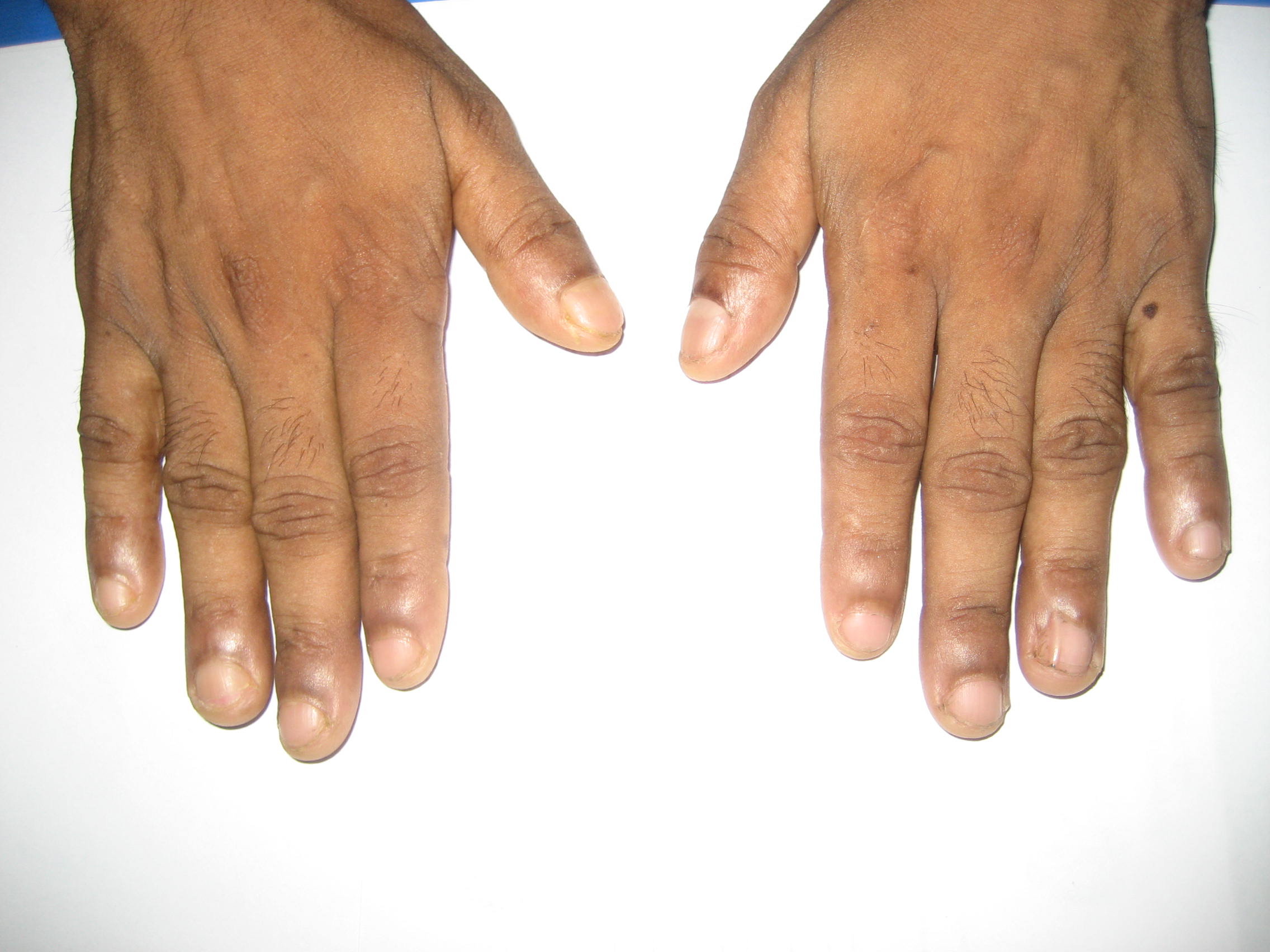 When he presented at BIRDEM in July 2012 at the age of 26 years, his height was 140 cm and weight 37 kg. He entered puberty at the expected age and was father of two healthy children. His younger brother was also diagnosed with polyendocrine endocrinopathy. Physical examination revealed normal dentition, depapillated tongue, pitted and dystrophic nails (Figure 1), patchy alopecia, no eye brows or eye lashes and white patches in the oral cavity and skin. Scrapings were taken from the skin lesions and budding oval fungal cell with hyphae were identified by microscopy and a diagnosis of mucocutaneous candidiasis was made. Thyroid dysfunction was excluded as free thyroid hormone was 149.55 nmol/L (67-163 nmol/L) and TSH was 4.58 µIU/ml (0.6-4.5 µIU/ml). Hematological parameters were normal and vitamin B12 level was more than 2000 pg/ml (> 200 pg/ml) excluding pernicious anemia. Bone mineral density by DEXA scan showed osteoporosis (T score -2.5 and Z score -1.1). Renal and liver functions and abdominal imaging were all unremarkable. Finally, a diagnosis of APS type 1 was made based on the previous diagnosis of primary adrenal insufficiency and hypoparathyroidism, together with the current features of mucocutaneous candidiasis. He was put on replacement steroids and calcium supplementation therapy. He was given systemic and local antifungal therapy for candidiasis and triamcinolone injections for alopecia areata.