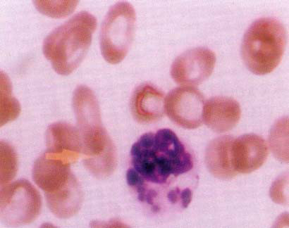 Fig-1a: Blood film showing elliptocytosis and giant inclusions in a polymorph (Wright’s stain).