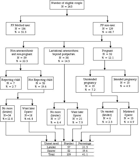 Out of the 265 respondents, 136 (51.3%) were using a contraceptive at the time of interview. Figure 1 presents a flow chart showing the varieties of subgroups of unmet need for family planning among the study group. The figure also shows the estimated proportion of women in each subgroup, either included in or excluded from unmet need, magnitude of unmet need and the magnitude of the two components- unmet need of limiting and spacing, which existed in urban slums at the time of study. The unmet need was 41.1%, which included 21.5% of women who wanted to limit and 19.6% of women who wanted to delay childbirths. Among the three subgroups of non-user women, the subgroup of the non-amenorrheic non-pregnant women is most important, accounting for 19.6% unmet need. The pregnant women accounted for 7.2%, and the amenorrheic women accounted for 14.3% of the unmet need.