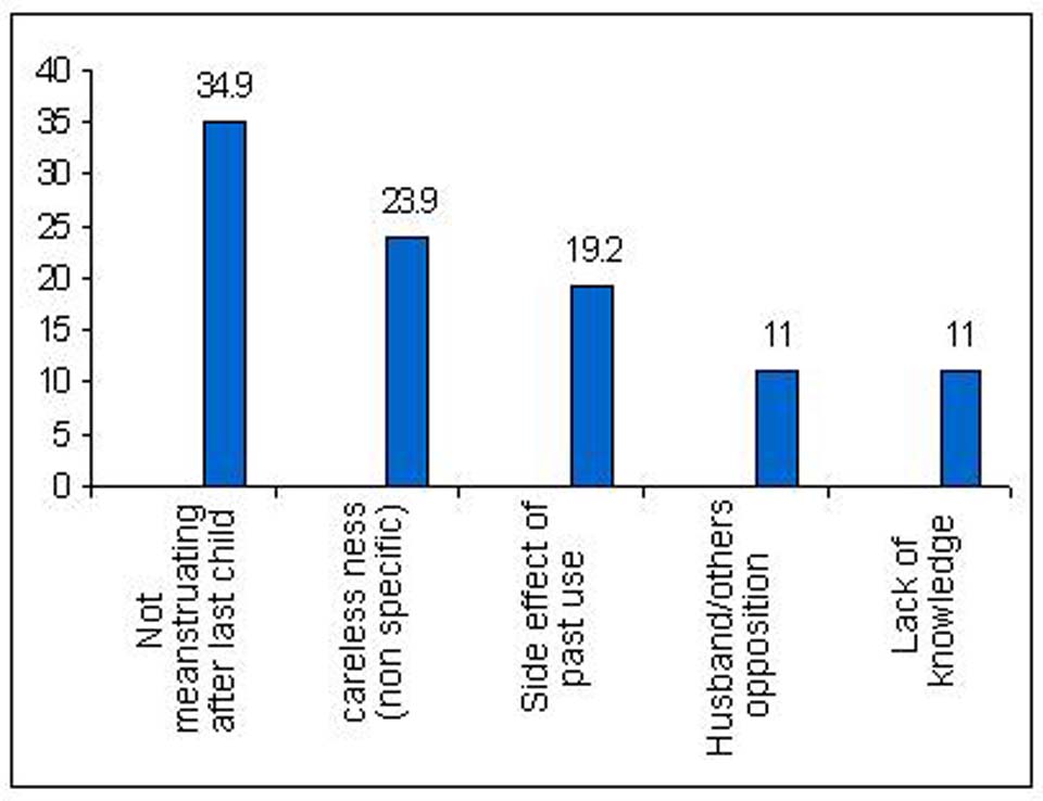 About 35% of the respondents with unmet contraceptive need mentioned not menstruating after last child birth as reason of non-use of any method though they are all beyond the post partum period, about 24% did not specify any reason of unmet need, side effect of past use were 19%, discouraged by husband or other family members were 11%, did not know about any method or did not know where to get contraceptives from were also 11% (Figure 2).