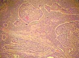 Fig-3. Insular pattern with peripheral pallisading (10X, hematoxyllin and eosin stain)