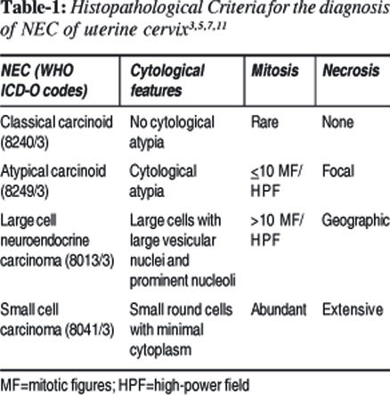 Table-1: Histopathological Criteriafor the diagnosis of NEC of uterine cervix3,5,7,11