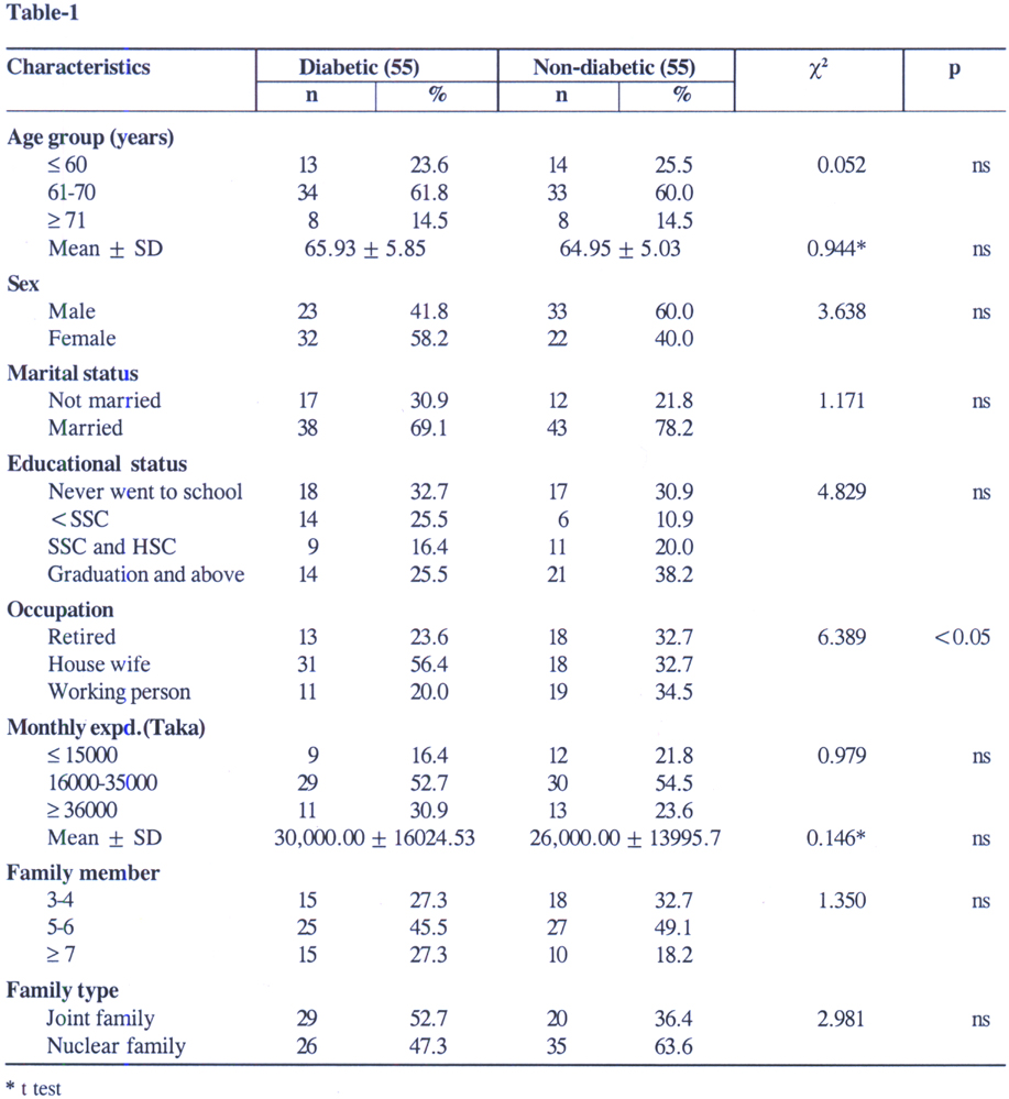 Considering the Bangladeshi population structure and life expectancy at birth, the current study defined those, who were ³55 years, as elderly whereas most international studies on this issue consider ³60 years as the cut-off point. However, ³60 years old elderly constitute three fourths of this study sample. The mean (±SD) age was 64.95 ± 5.03) years in non-diabetics and 65.93 ± 5.85 years in the diabetic subjects. Sinclaire et al.17 included samples with mean (±SD) age of 75 ± 7.1 years (diabetic) and 75 ± 6.9 years (non-diabetic). Although two groups were not matched initially but the data showed that both the groups were similar in socio-demographic characteristics except for their occupational status. Housewives were in higher proportion (56.4%) in diabetic group and other occupations i.e., working persons (34.5%) and retired (32.7%) were more in the non-diabetics.