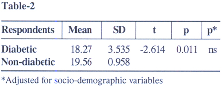 The level of functional independence was measured by using Barthel Index (BI), a scale which measures the basic activities of daily living with higher scores indicating greater independence. This is an internationally accepted ordinal scale that measures the degree of independence from any help, physical or verbal for minor or major reasons. Diabetics scored, on average, lower Barthel points (18.27) than the non-diabetic respondents (19.56, p<0.05). It also showed similarity with the result of the study done by Sinclaire et al. (p<.0001).17 However, the difference did not remain significant in the current study after removing the effect of socio-demographic variables.