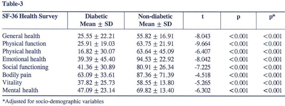 Table-3: Score of different categories of SF-36 Health Survey in diabetic and non-diabetic respondents
