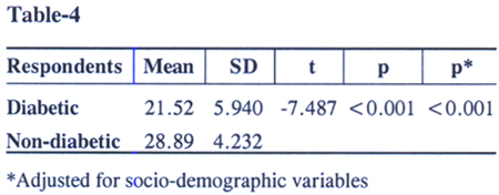 Table 4: shows the comparison in the mean score of modified physical performance test between diabetic (21.52) and non-diabetic (28.89) persons. The difference in the mean score between diabetic and non-diabetic respondents was statistically significant before and after adjusting for the socio-demographic variables.