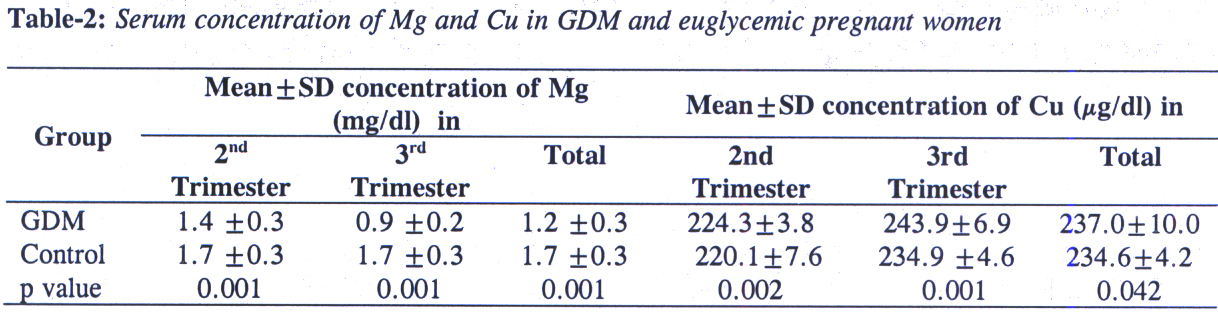 Table-2: Serum concentration of Mg and Cu in GDM and euglycemic pregnant women
