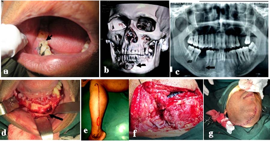 Fig-1: Photograph showing the mandibular bony defect and steps of reconstructive surgery. 1a: Absence of lower right 1st premolar tooth; 1b & 1c: Large perforation in the cortical plates as shown by CT scan and X ray; 1d: Excised mandible; 1e: The marked course of the fibula for obtaining graft; 1f & 1g: Reconstrctuted graft. Arrow indicates the lesions